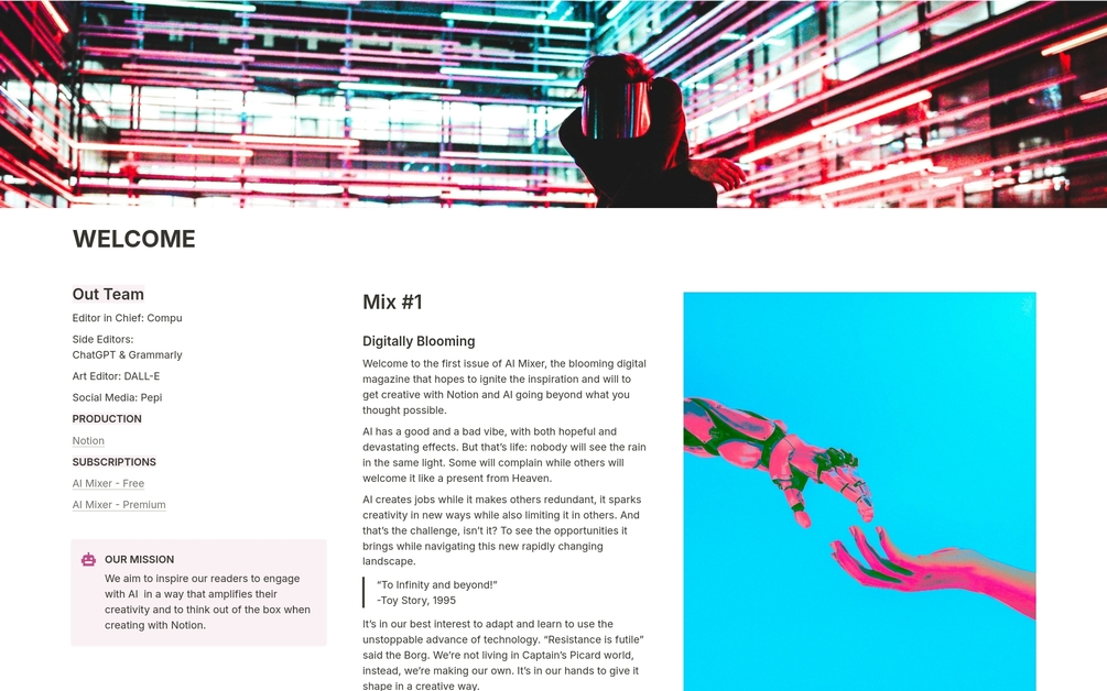 AI Mixer Magazine is a blooming digital magazine that hopes to ignite inspiration and get creative with Notion and AI, going beyond what you thought possible. This is both a magazine and a template. Though lorem ipsum templates are great, we like to have a digital magazine that can be mixed, just like DJs do with tracks!